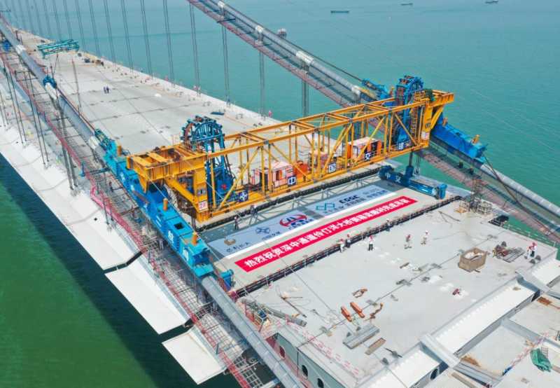 “钢箱梁节段具有超宽超大特点,结构形式复杂,组装精度高,”中交二航局深中通道项目副经理张平介绍,“每一次吊梁都是海陆空的联合作战,最难的地方就是梁体的平衡性问题。项目团队研发建造850吨级智能化缆载吊机,解决了大吨位、大跨度悬索桥箱梁节段吊装同步稳定性差、起重能力和起升速度无法保证的难题。”