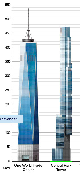 英文名称:Central Park Tower项目原名:Nordstrom Tower坐标:纽约曼哈顿中城建筑原规划高度(带天线):541米(1775英尺)调整后的建筑高度:472.4米楼层:地上131层,地下4层开发商:Extell、上海建工美国子公司建筑设计:Adrian Smith + Gordon Gill项目提出:2010年项目开工:2014年项目建成:2020年最初的设计方案是带天线的,总高度与美国第一高楼纽约世贸中心一号楼基本一致。