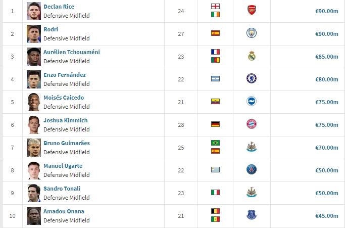 直播吧7月15日讯 在德转的防守型中场身价榜中,赖斯与罗德里身价最高。