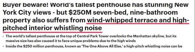 超高层住宅的诸多问题,在这里同样显现出来。与普通高层住宅一样,水压低、噪音问题、电梯故障等等,都成为了住户们不得不面对的现实。甚至那套以2.5亿美元售价的“全美最贵公寓”也无法摆脱这些问题的困扰,尖锐的哨声、楼体的晃动,以及频繁的电梯故障,都让居住体验大打折扣。