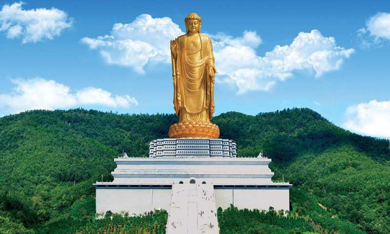 这座雕像位于中国河南省的平顶山市,是世界上最高的佛教造像。它建于2002年,高153米,由中国人设计,由钢筋混凝土制成,外涂金色,内部有电梯和楼梯,形象是一位手持法轮的释迦牟尼佛,象征着智慧和未来。它的建造目的是为了纪念中国的佛教文化,也是为了祈祷中国的和谐和富强。