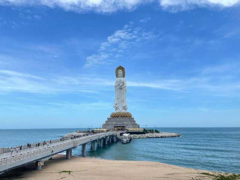 这座高耸入云的观音像,如同一尊仙女屹立在蔚蓝的海天之间,向游客和信徒传递着慈悲与祝福。