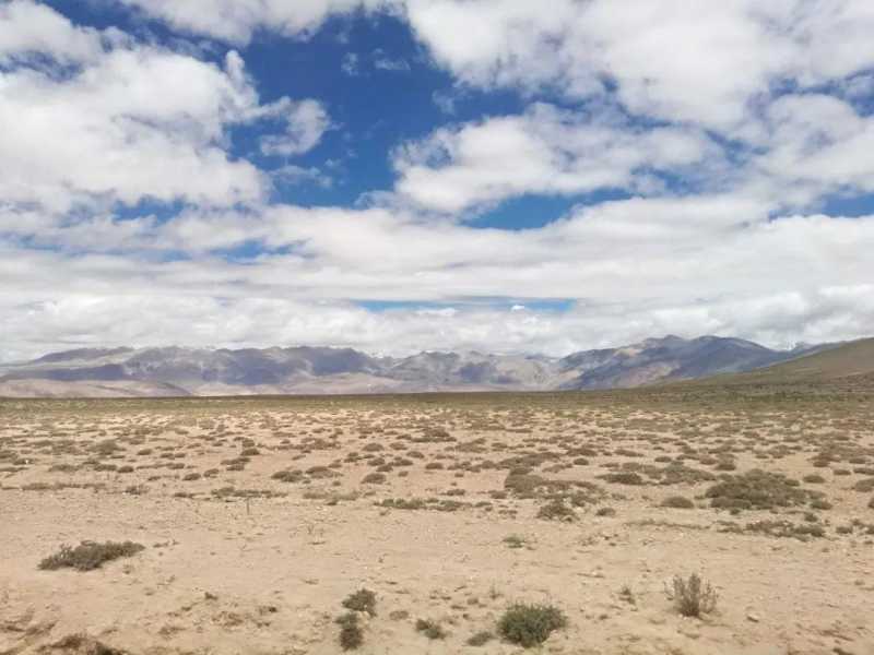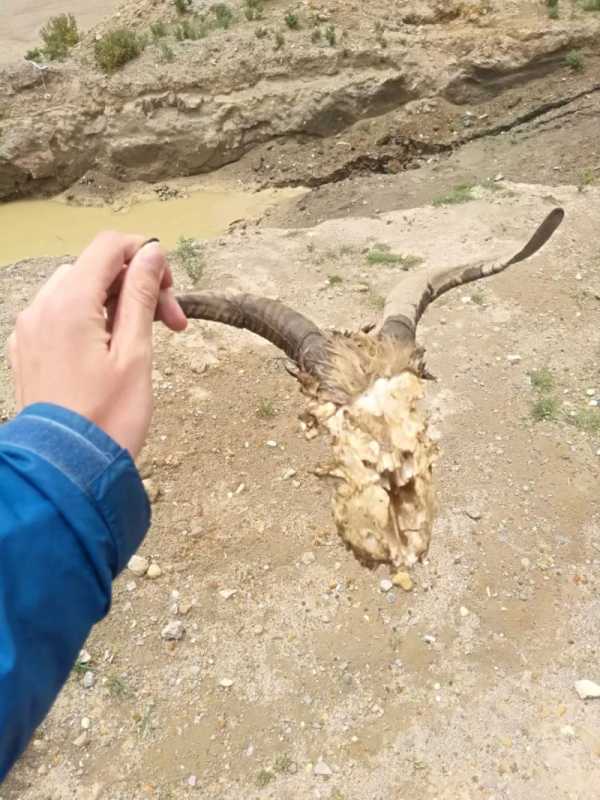 过了拉孜,就开始逐渐远离雅鲁藏布江水域,海拔升高,气候也越发干燥。路边的植被逐渐稀少,离开了国道之后,车辆更为稀少,道路两边也变得宛如戈壁。休息时,我在路边捡到一个死去多时的盘羊头骨,发现羊头原来如此之小。