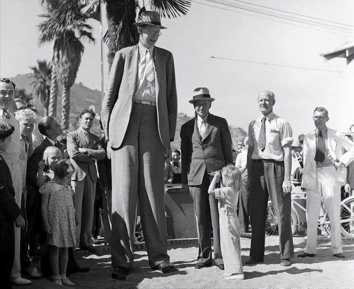 他可不是生来就这么大块头,而是因为患上了一种叫做垂体肥大的疾病,让他像春天的竹笋一样,噌!噌!噌!地往高里窜,直到他离开人世的时候他的身高已经达到了让人惊讶不已的8英尺11英寸。(换算成米的话就是2米70多)!