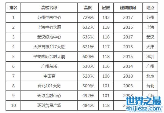 | 2 | 上海中心大厦 | 632米 | 118 | 2015 | 上海 |