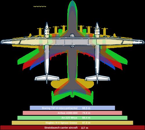 Stratolaunch的翼展达117米,重227吨,机身高度为15米,一次可携带113吨燃油,由6台波音747飞机引擎驱动。