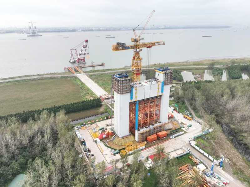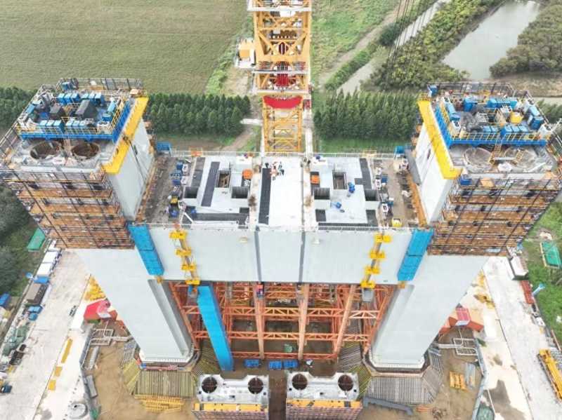 张靖皋长江大桥南航道桥北主塔采用世界首创的钢箱-钢管混凝土约束组合体系,包含上、中、下塔柱,每个塔柱划分为30个节段,内设4根直径3.6米的钢管约束混凝土柱。该体系充分发挥钢管混凝土优异的承压性能,减小塔身自重50%。同时,北主塔实现了索塔节段工厂化制造、现场装配化施工,极大地提升了桥塔工业化建造水平。单个塔柱耗用3.4万吨钢材,相当于4.6座埃菲尔铁塔的用钢量。