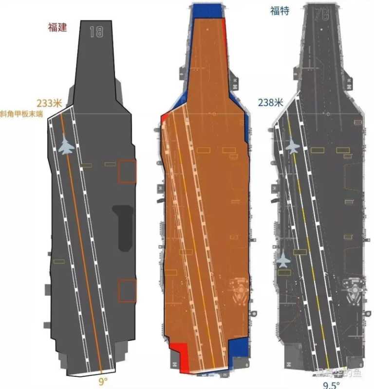 ▲目前福建舰与美国“福特”级的尺寸对比图