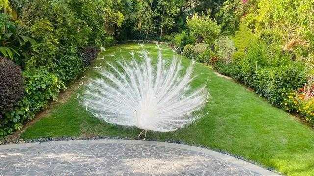 步入度假区花园,经过一条曲径通幽的路,便看到一片葱翠的竹林,竹林深处是一栋典雅幽静的别墅,别墅的旁边是一个绿草如茵的大草坪,草坪上散养着几只白色和蓝色的孔雀,看到人也不害怕,其中有一只还大方地开了一次屏,引得众人称赞。