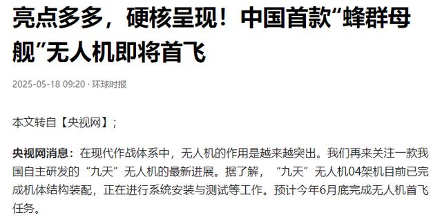 5月17日,我国“九天”无人机04架机已经完成了机体结构的装配,正在进行系统的安装和测试工作,预计在今年六月底完成无人机首飞任务。