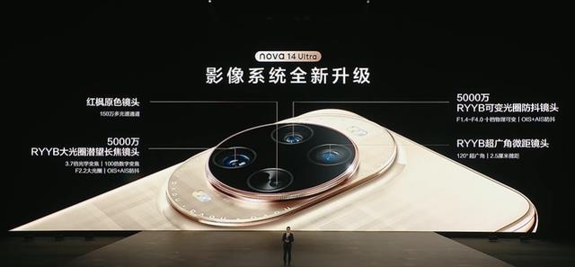 其中之一是“红枫原色镜头”,色彩还原准确度大幅提升;还有三颗5000万像素RYYB镜头,分别是F2.2大光圈潜望长焦镜头,支持3.7倍光学变焦、100倍数字变焦,支持OIS+AIS防抖;F1.4-F4.0十档物理可变光圈防抖镜头;120°超广角微距镜头,支持2.5厘米微距。