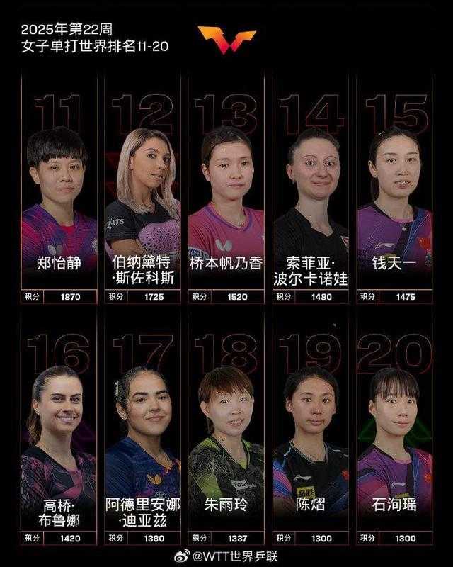 国际乒联2025年第22周世界排名 孙颖莎创历史最高积分