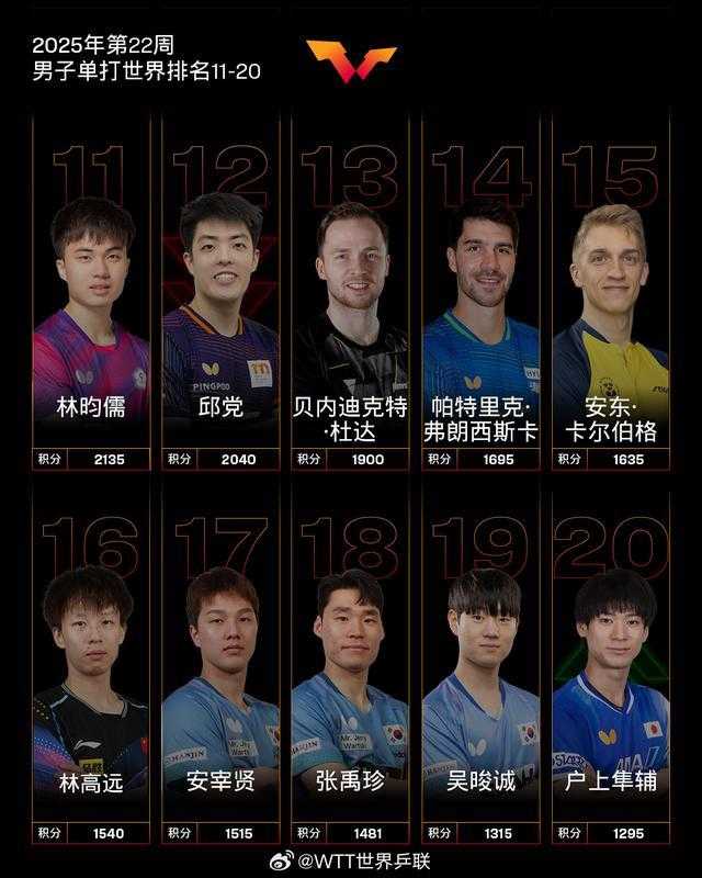 男单方面,林诗栋保持排名第一,王楚钦第二,梁靖崑第五。多哈世乒赛男单季军特鲁斯·莫雷加德排名上升1个名次位列第6;向鹏排名上升1个名次位列第8,刷新个人职业生涯新高;吴晙诚排名上升2个名次位列第19,刷新个人职业生涯新高;户上隼辅排名上升10个名次位列第20;西蒙·高茨排名上升8个名次位列第35;汤姆·贾维斯排名上升61个名次位列第78,刷新个人职业生涯新高。