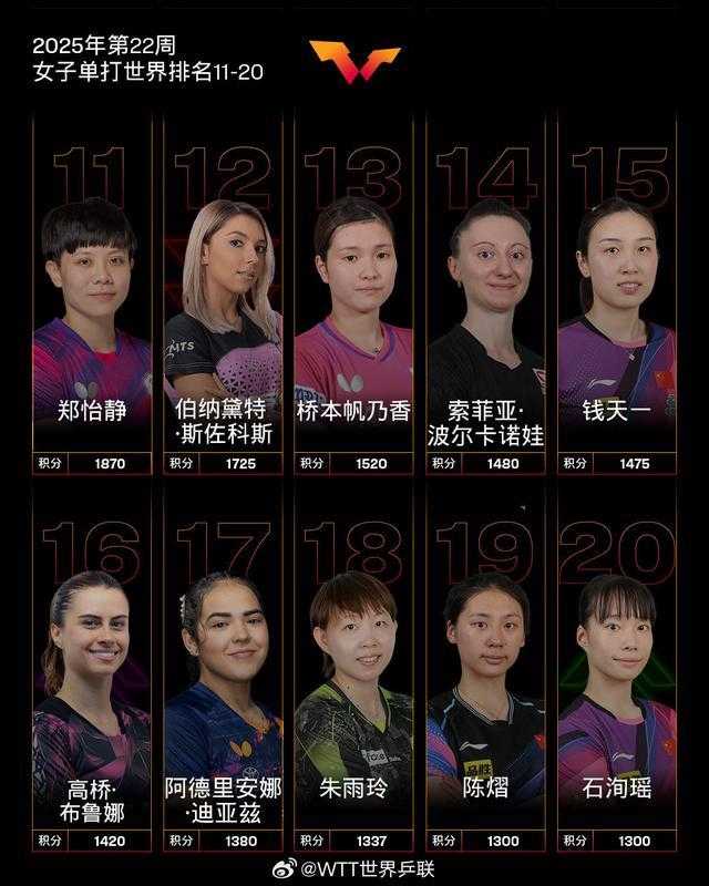 世界乒联公布2025年第22周排名。女单方面,凭借多哈世乒赛冠军的优异表现,孙颖莎进一步巩固领先地位,以11900分继续霸榜第一,并刷新自己保持的WTT历史最高积分纪录。王曼昱、陈幸同、王艺迪和蒯曼排名2-5位。