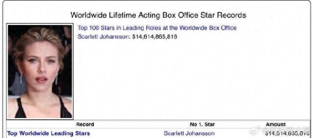 据悉,斯嘉丽目前总票房达146.14亿美元,略微超过排名第二的影坛常青树塞缪尔·杰克逊,后者目前以146.05亿美元总票房位居第二。