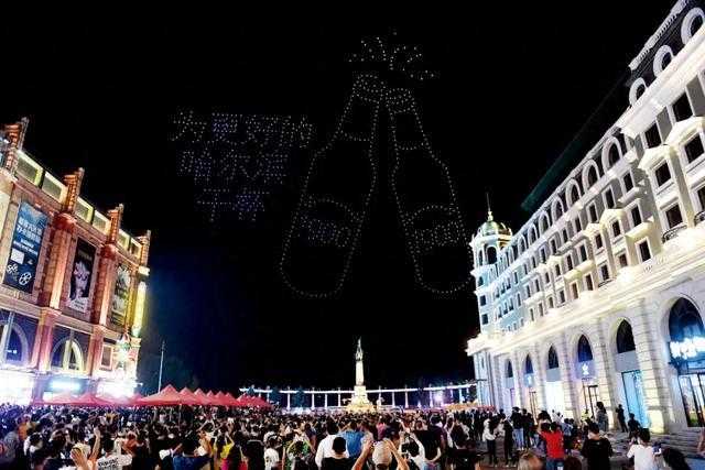 2020年8月23日晚,在哈尔滨市人民防洪胜利纪念塔广场,800架无人机声光秀点亮冰城夜空,祝贺哈尔滨啤酒120周年。图/视觉中国
