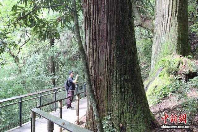 9月12日,游客在柳杉前拍摄照片。位于浙江杭州的浙江天目山国家级自然保护区拥有全球最大的柳杉古树群,群落中树龄在500年以上的柳杉有500余株,胸径超50公分的柳杉有2000余株。除柳杉外,该保护区还孕育着金钱松、天目铁木等各类古木,被称为“大树王国”。吴怡欣 摄