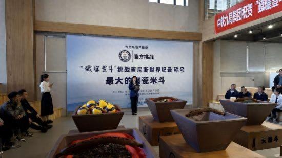在认证环节,黑龙江省陶瓷艺术大师王洋、国宴大师张帅林、中铁九局集团伊春市五一劳动奖章获得者刘健涛、佳新优稻谷物种植农民专业合作社理事长项佳新、铁力一中女排主教练李维等8名代表将注满水稻的玻璃器具中的大米缓缓倒入米斗,象征五谷丰登、产业兴旺。吉尼斯认证官现场测量并宣布:“鐵驪豐斗”世界最大的陶瓷米斗认证成功。