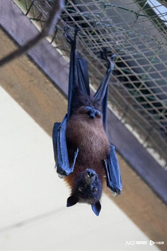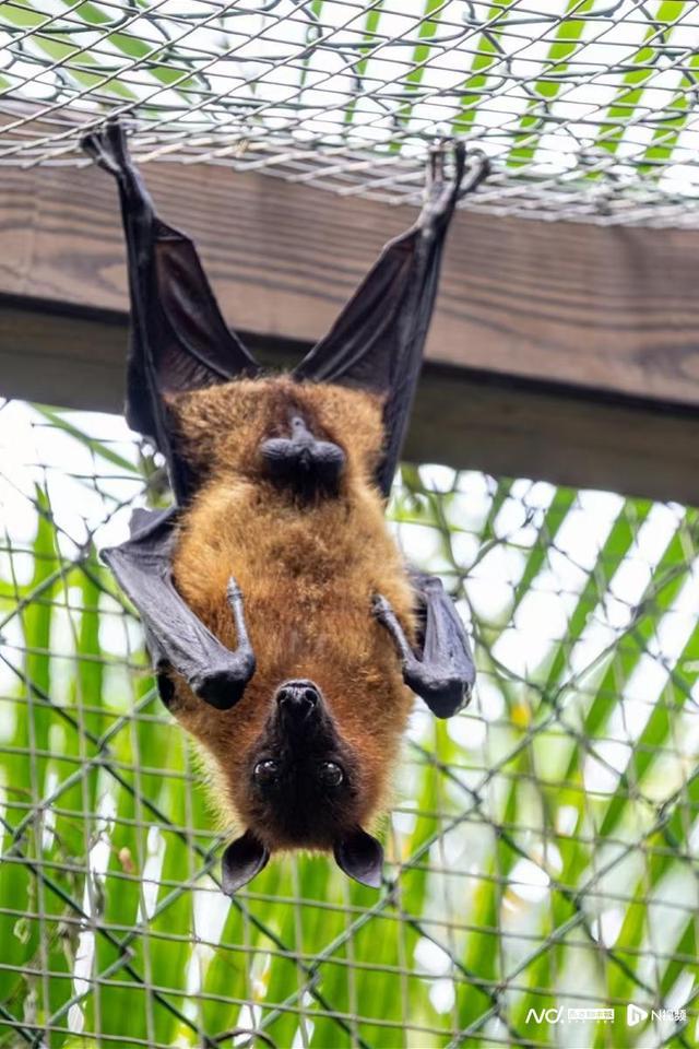 在狐蝠展区内,体型庞大的马来大狐蝠悬挂休憩时翼膜收拢,形如深色皮裘,展翅活动时,其接近两米的翼展令人惊叹。而在另一侧,有着棕红色皮毛、面庞似狐、体型稍小的印度狐蝠则显得更为灵动。长隆鸟类保育专家严淦才介绍,马来大狐蝠是世界上体型最大的蝙蝠之一,主要分布在印度尼西亚与马来西亚等地,由于非法猎杀,种群数量下降明显,已被世界自然保护联盟(IUCN)列为“濒危”(EN)级别,野外种群正面临严峻的生存威胁。