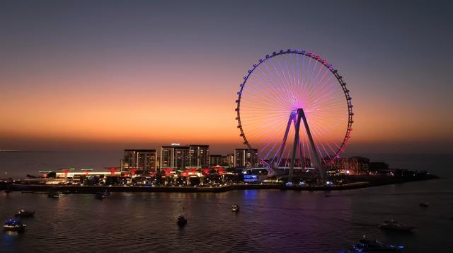 这是当今世界上最大且最高的观景摩天轮,位于迪拜码头附近的蓝水岛上,它从2015年开始兴建,中间由于工程延期以及疫情影响直到2021年10月21日才开放。这座摩天轮的高度与直径都是250米,拥有48个客舱最多可同时搭载1750名乘客。透过它的观景窗可以在约38分钟的时间里,欣赏迪拜码头、哈利法塔以及棕榈岛等知名地标。