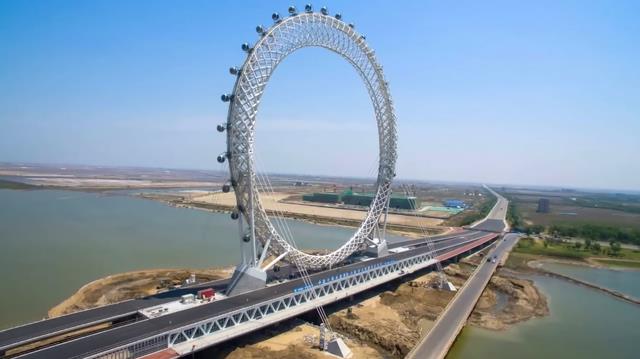 渤海之眼,坐落于山东省潍坊市滨海区,是一座颠覆传统设计的摩天轮,其145米的高度虽然不算突出,但其独特的“无轴式”设计使其在全球摩天轮家族中独树一帜,它于2018年建成,拥有36个酷似太空舱的透明轿厢,旋转一周约需30分钟,可俯瞰渤海湾的壮丽景色。乘客舱沿着轮盘外缘轨道运行。这种设计使其外观宛如一个巨大的银色指环,悬浮于白浪河大桥之上,科技感与未来感十足。