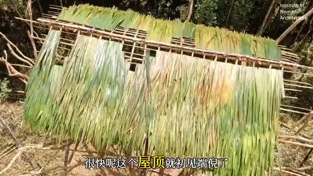 再来看他们怎么铺设叶子的,方法非常巧妙,很快屋顶就初见端倪了。最后是屋脊的铺设,方法也非常巧妙。在上面搭上一层之后怎么固定?它们两边各用一根棍子压着,最后还要再加固几道,这样就滴水不漏了。