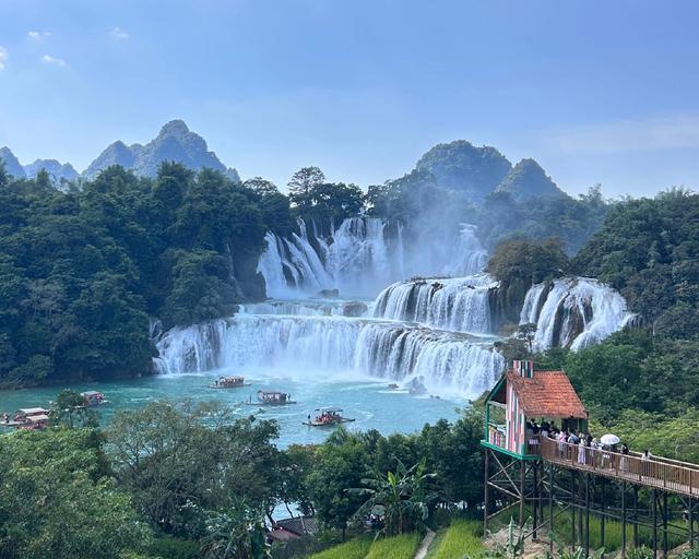 德天瀑布是中越界河归春河孕育的奇观,三级叠瀑宽200余米、落差70余米,年均水流量是黄果树瀑布的三倍,为亚洲第一跨国瀑布,与越南板约瀑布相连,成就“一瀑跨两国”的绝景。乘竹筏近观,水雾蒸腾、彩虹常挂;登观景台俯瞰,两国山水风光尽收眼底,秋季水量充沛时气势更盛。