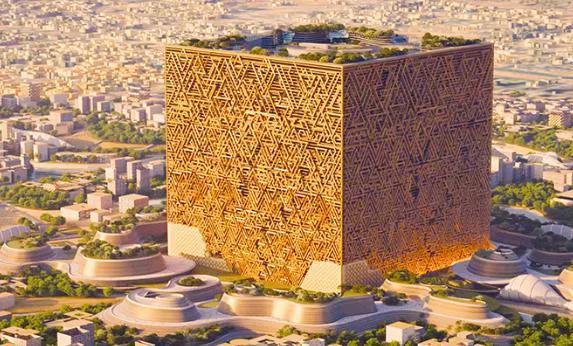 穆卡布四方城(Mukaab)的建造地点位于沙特阿拉伯首都利雅得,若要用一句话形容穆卡布四方城的“野心”,那便是“把20座帝国大厦塞进一个立方体”。这座建筑是沙特New Murabba中心区的核心,边长和高度都有足足400米,总建筑面积有数百万平方米,内部规划了螺旋塔楼、沉浸式穹顶,还塞进了数量惊人的酒店、零售、文化和娱乐设施。