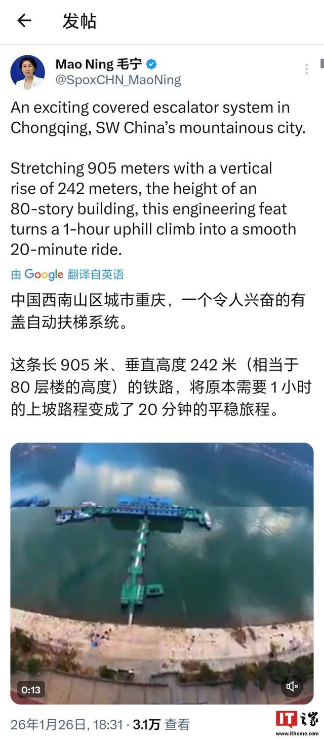 值得一提的是,今年 1 月,外交部发言人毛宁还在海外社交平台向全球网友介绍了巫山神女大扶梯。