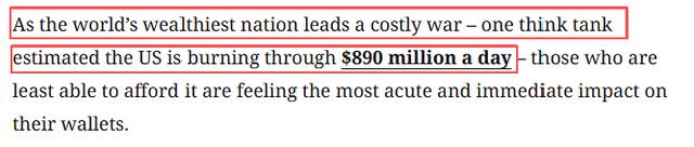 文章说,美国与以色列联合对伊朗发动的军事打击导致全球燃料供应紧张。世界上最关键的能源运输通道之一——霍尔木兹海峡实际上已陷入停滞。当全球最富裕国家发动一场代价高昂的战争时(据智库预计,美国每天要因此烧掉8.9亿美元),最无力承受的民众却最先感受到钱包急剧缩水的切肤之痛。数千万人被告知要调高空调温度、随手关灯、减少差旅,甚至居家办公以节约能源。