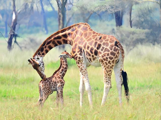 小长颈鹿来到这个世界的方式很特别,是从近2米的高度“摔”下来的。别担心,这并不是伤害,而是一次强大的生命启动仪式,能帮助幼崽激活肺部,几小时后就能独立奔跑。