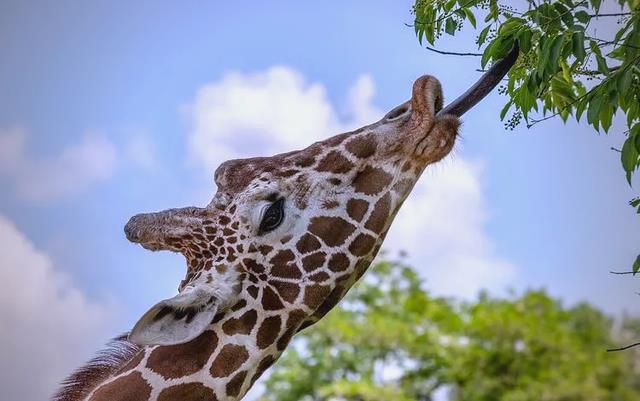 这舌头灵活得像手一样,能轻松卷开枝叶,还能巧妙避开尖刺。每天,长颈鹿要吃掉几十公斤的植物,这根舌头就是它们最得力的工具。