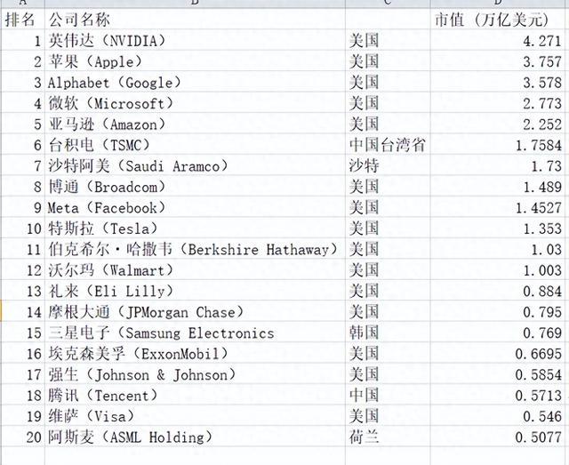 我们首先要看清楚现实,20强里美国独占15席、且包揽前5,英伟达、苹果、谷歌、微软、亚马逊,总市值超过16万亿美元。