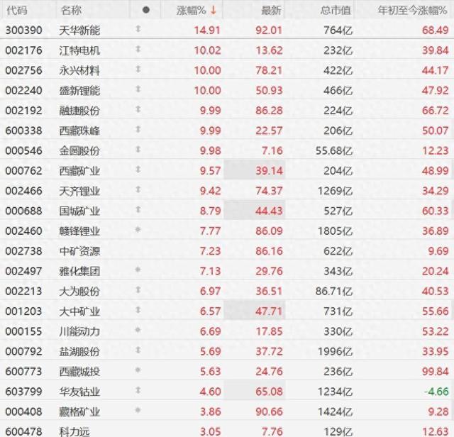锂矿股集体走强,天齐锂业逼近涨停,全球最大锂矿降低全年产量预测 4月24日,A股市场锂矿股集体走强,其中,天华新能大涨近15%,江特电机、永兴材料、盛新锂能、融捷股份、西藏珠峰、金圆股份10CM涨停,西藏矿业、天齐锂业逼近涨停,国城矿业涨超8%,赣锋锂业、中矿资源、雅化集团涨 ... 世界最高04-25