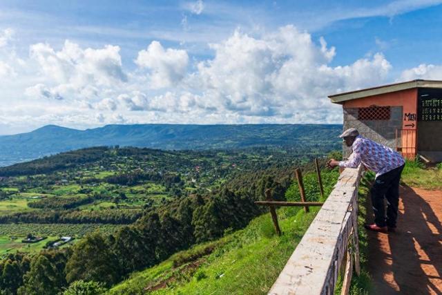 4月21日,在肯尼亚基安布郡,游客在一处观景台观看东非大裂谷景观。新华社记者谢剑飞摄