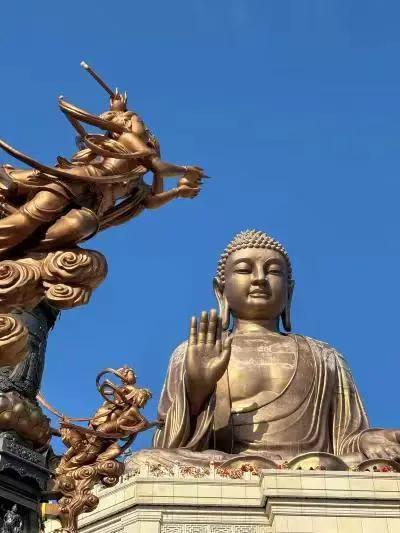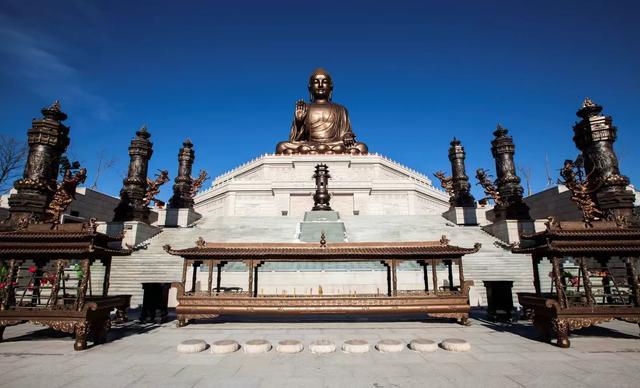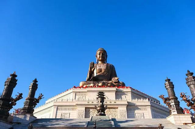 这尊释迦牟尼青铜坐像,总高48米,是世界最高的青铜坐佛,被誉为“东北第一露天大佛”。