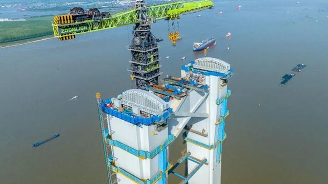 该创新结构可将滚轴摩擦系数精准控制在千分之一量级,接触面平整度达0.3毫米,具备自适应主缆缆力变化的能力。南主塔是全桥唯一一座江中主塔,在施工过程中吊装姿态偏差需严格控制在毫米级以内,同时还要直面350米高空作业、超重型构件吊运等多重挑战,整体施工技术难度极高。