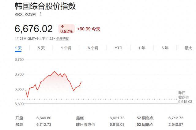 据韩国交易所消息,KOSPI当天以6646.8点开盘,较前一交易日高开0.48%,之后震荡上行,截至当地时间上午10时7分,指数较前一交易日上涨86.88点(1.31%),报6701.91点。这是KOSPI盘中首次突破6700点。