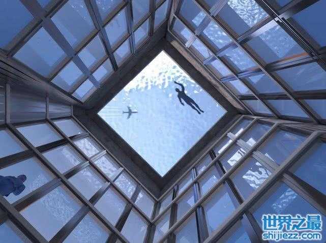 除了四面不设围墙,这个泳池的地板还将采用铸造丙烯酸材料,这种材料可以将类似波长的光传输到水中,看起来是透明的但是比传统的玻璃更清晰。据说用了这种材料,人在楼顶的泳池游泳,下面的人都能看得清清楚楚,甚至还能透过池底和池水看到天上的飞机。