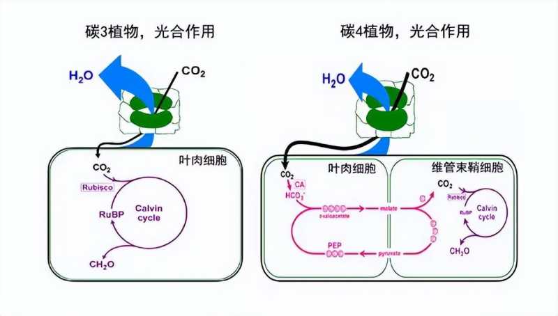 碳4植物同样是RuBisCO来催化二氧化碳,但这类植物的做法明显更加高明,它们的叶子有两种分开工作的细胞——叶肉细胞和束鞘细胞,从而让RuBisCO周围充满二氧化碳,避免氧化作用的竞争,从而减少光呼吸浪费。