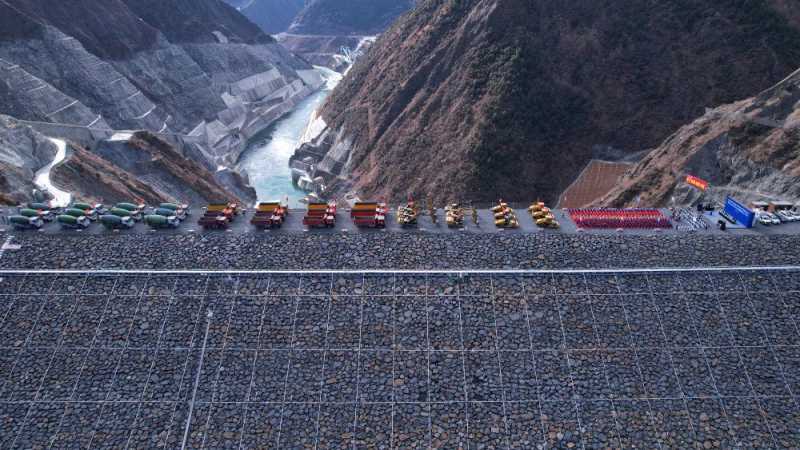 ↑12月29日,雅砻江两河口混合式抽水蓄能电站开工仪式在四川雅江两河口水电站大坝上举行(无人机照片)。