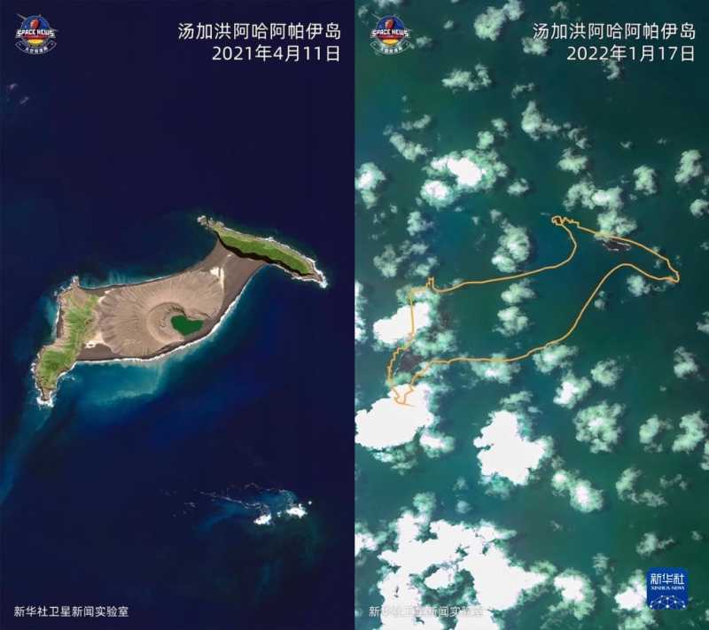 2021年4月11日Worldview02卫星拍摄的汤加洪阿哈阿帕伊岛卫星图片(左)和2022年1月17日“高分一号”卫星拍摄的该岛火山喷发后的卫星图片,橘色曲线为按照地理坐标标注出的岛屿原先轮廓(拼版照片)。新华社发(新华社卫星新闻实验室供图)