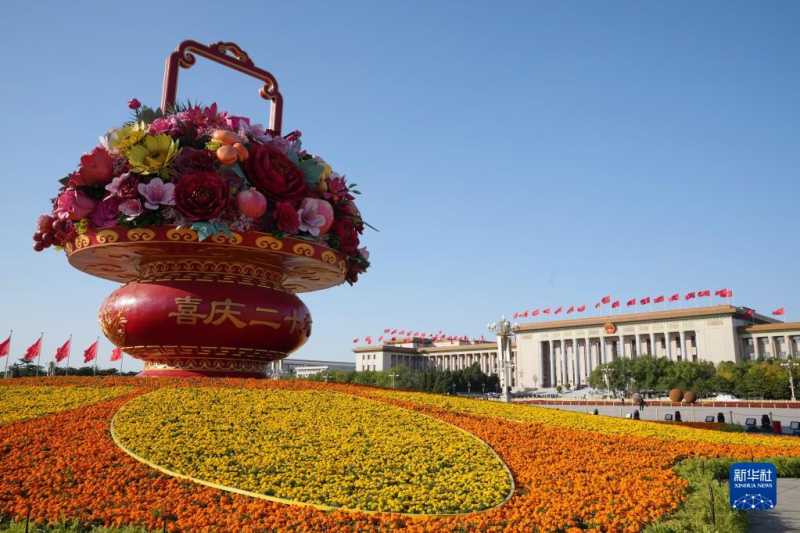 这是2022年10月16日在天安门广场拍摄的“祝福祖国”巨型花果篮。中国共产党第二十次全国代表大会于10月16日至22日在北京举行。新华社记者 王毓国 摄