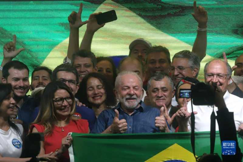 这是2022年10月30日,卢拉(前中)在巴西圣保罗参加庆祝活动。巴西高等选举法院当地时间10月30日晚公布的统计结果显示,在当天举行的巴西大选第二轮投票中,劳工党候选人、前总统卢拉战胜自由党候选人、现总统博索纳罗,当选新一任巴西总统。新华社发(拉赫尔·帕特拉索摄)