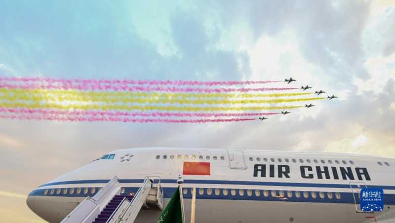 这是2022年12月7日,国家主席习近平抵达沙特阿拉伯首都利雅得,出席首届中国-阿拉伯国家峰会、中国-海湾阿拉伯国家合作委员会峰会并对沙特进行国事访问时,礼宾护卫机在空中拉出象征中国国旗的红黄两色彩带。新华社记者 谢环驰 摄