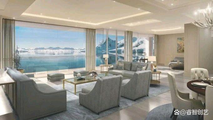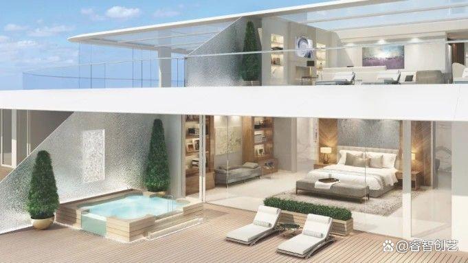 居室还有 16 间复式和三层式公寓,配有私人电梯。室內设计由 David Linley 和 Kelly Hoppen操刀,他们以不同的调色板及材料和风格设计了令人响往的海上住宅。其中Linley 提供的是清新、现代之风,而 Hoppen走的是国际化。其他参与设计者还包括世界著名的 Denniston事务所的Jean-Michel Gathy; FM Architettura 的 Francesca Muzio;Taylor Howes; Sabrina Monte-Carlo 的 Sabrina Monteleone等,以确保住宅和公共空间的不雷同,更像私人住宅。这15 钟订制设计平面图,堪比陆上豪宅。