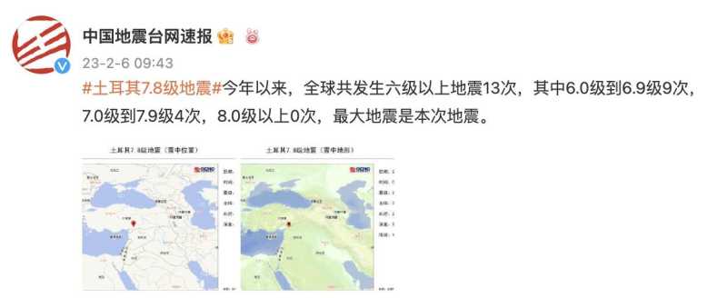 中国地震台网速报官方微博消息称,土耳其此次7.8级地震为今年以来全球最大地震。