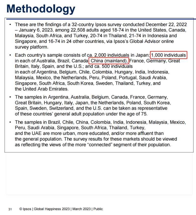 其次,就是调查报告调查的人数问题。调查报告的第31页就说了,这份调查报告在我国一共才调查了1000人左右。人数最多的是日本,但也不过2000人左右。最少的也就500来号人。