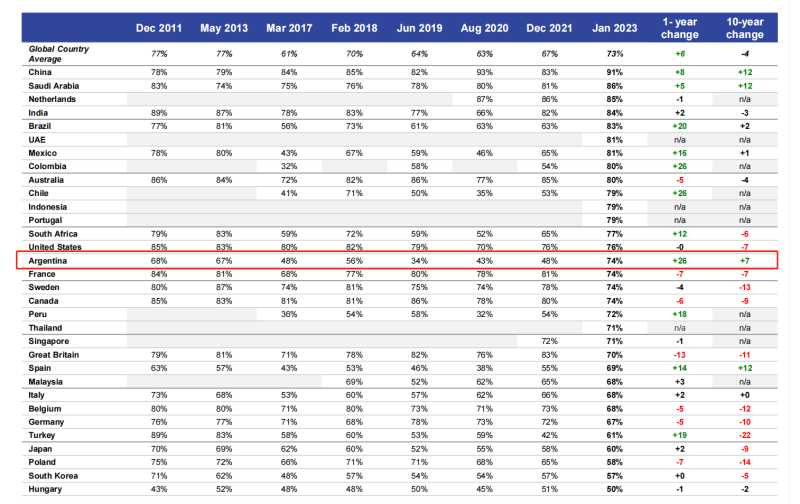 首先就是阿根廷。在这份报告里,哥伦比亚、智利、阿根廷这三个国家的涨幅最高,涨了26%,而阿根廷却是这三个国家里起点最低的。根据新华社3月15日报道,阿根廷2022年的累计通胀率高达94.8%,是近30年来最高,更夸张的是,在过去12个月内的累计通胀率超过了100%。通货膨胀率这么高,意味着衣食住行等等等等的生活成本涨得非常吓人。打个比方,比如说一年以前,在阿根廷一个月的生活费需要3000块钱打底的话,现在就得差不多6000块钱了。物价涨得这么凶,那为啥阿根廷人还这么高兴呢?