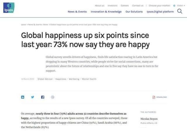 近日,国际知名民调机构益普索集团(Ipsos)发布了一份有关全球幸福指数的调查报告,结果显示,在32个国家中,幸福感指数最高的国家是中国(91%),其后是沙特阿拉伯(86%)和荷兰(85%)。